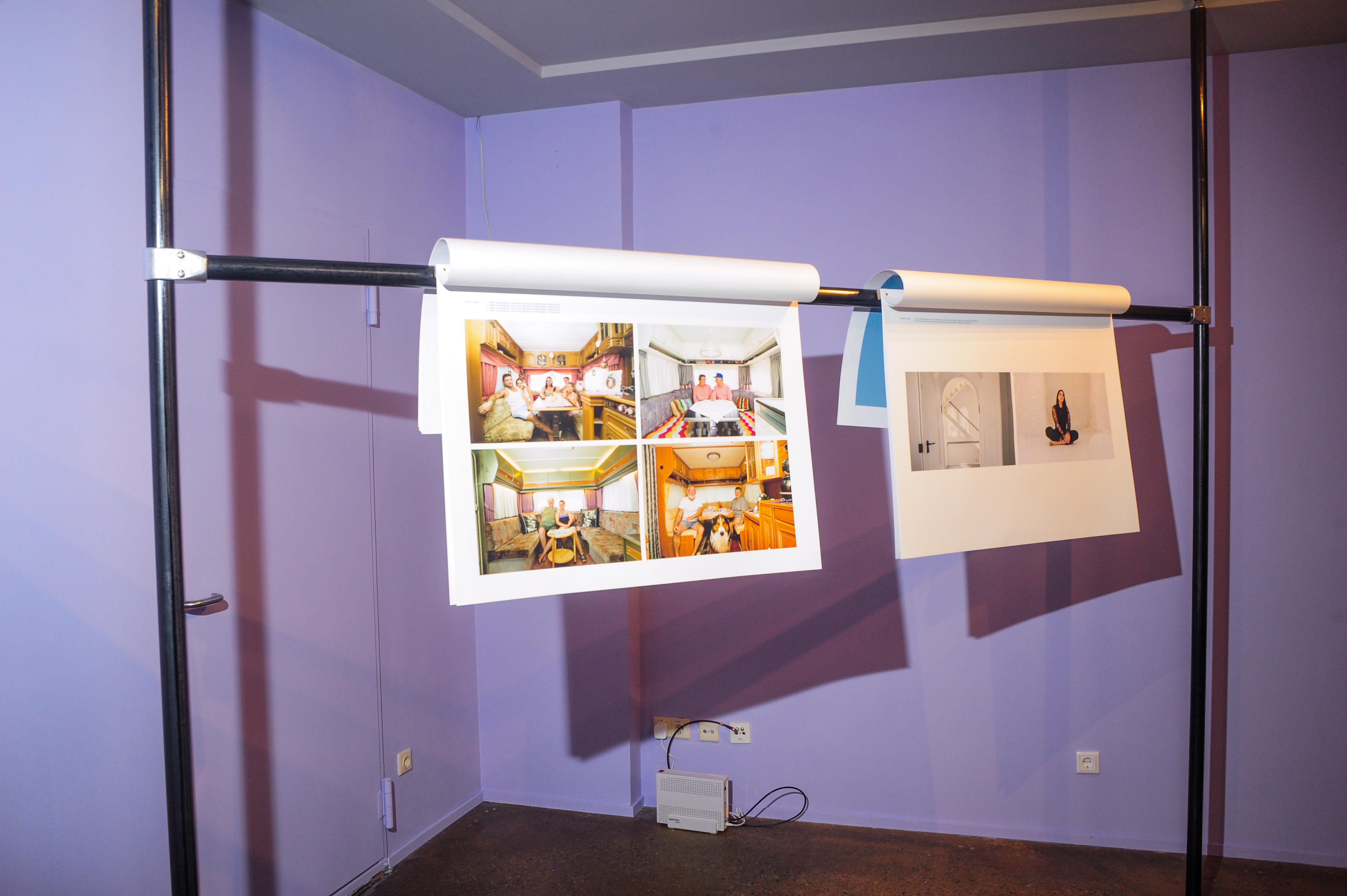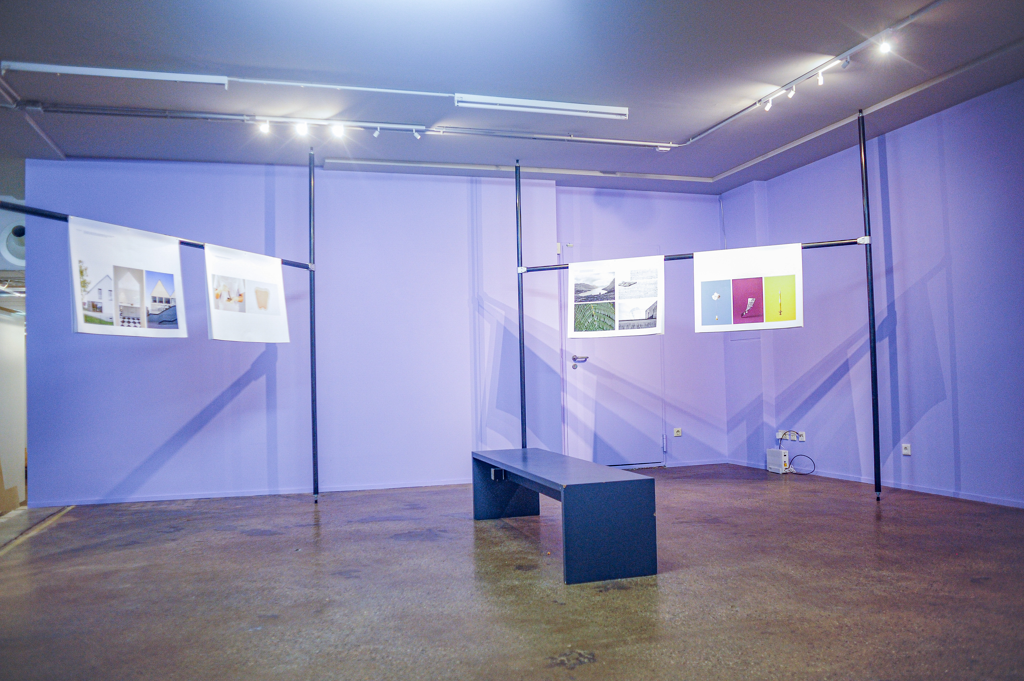 „Wir haben beim jeweils Anderen die besten Werke im Archiv ausgesucht“, erklärte Katharina Jaeger die Konzeption der Ausstellung. Es seien keine Arbeiten extra für die Ausstellung angefertigt worden. Die Besucher durften die auf großen Papierblättern gedruckten Werke selbst umblättern. Die Blätter waren an Traversen befestigt, die im Showroom zwischen Boden um Wand eingeklemmt waren.