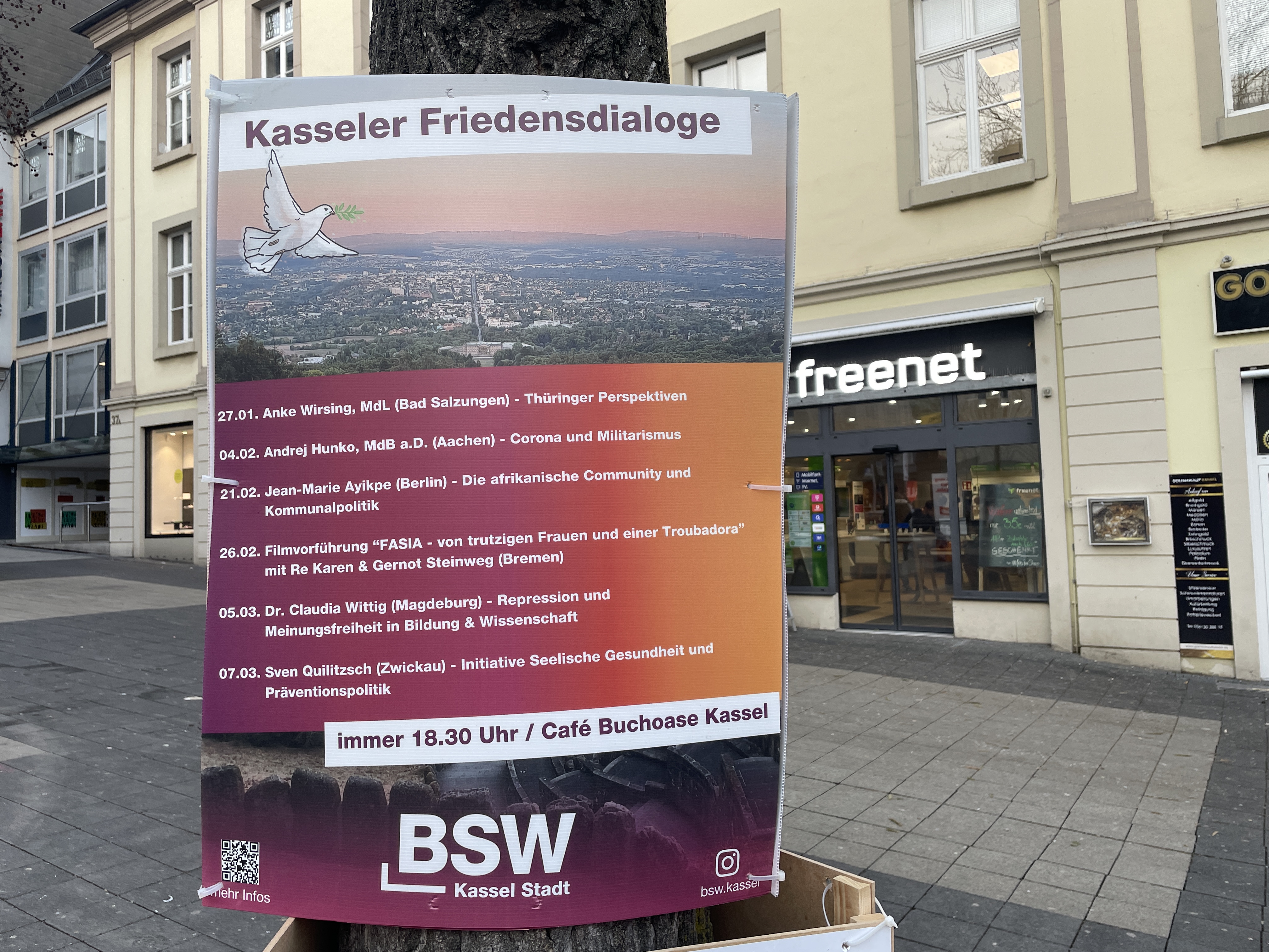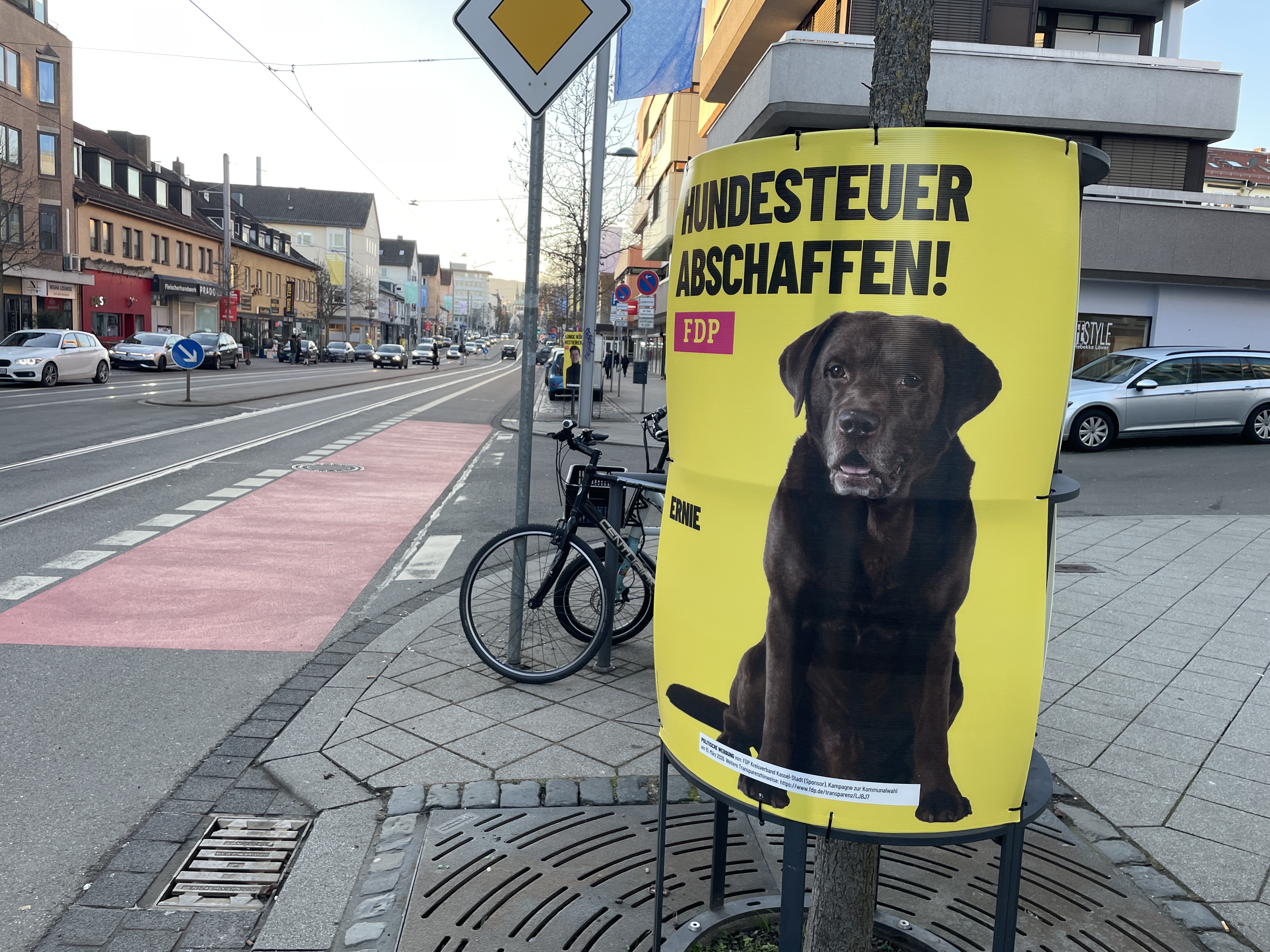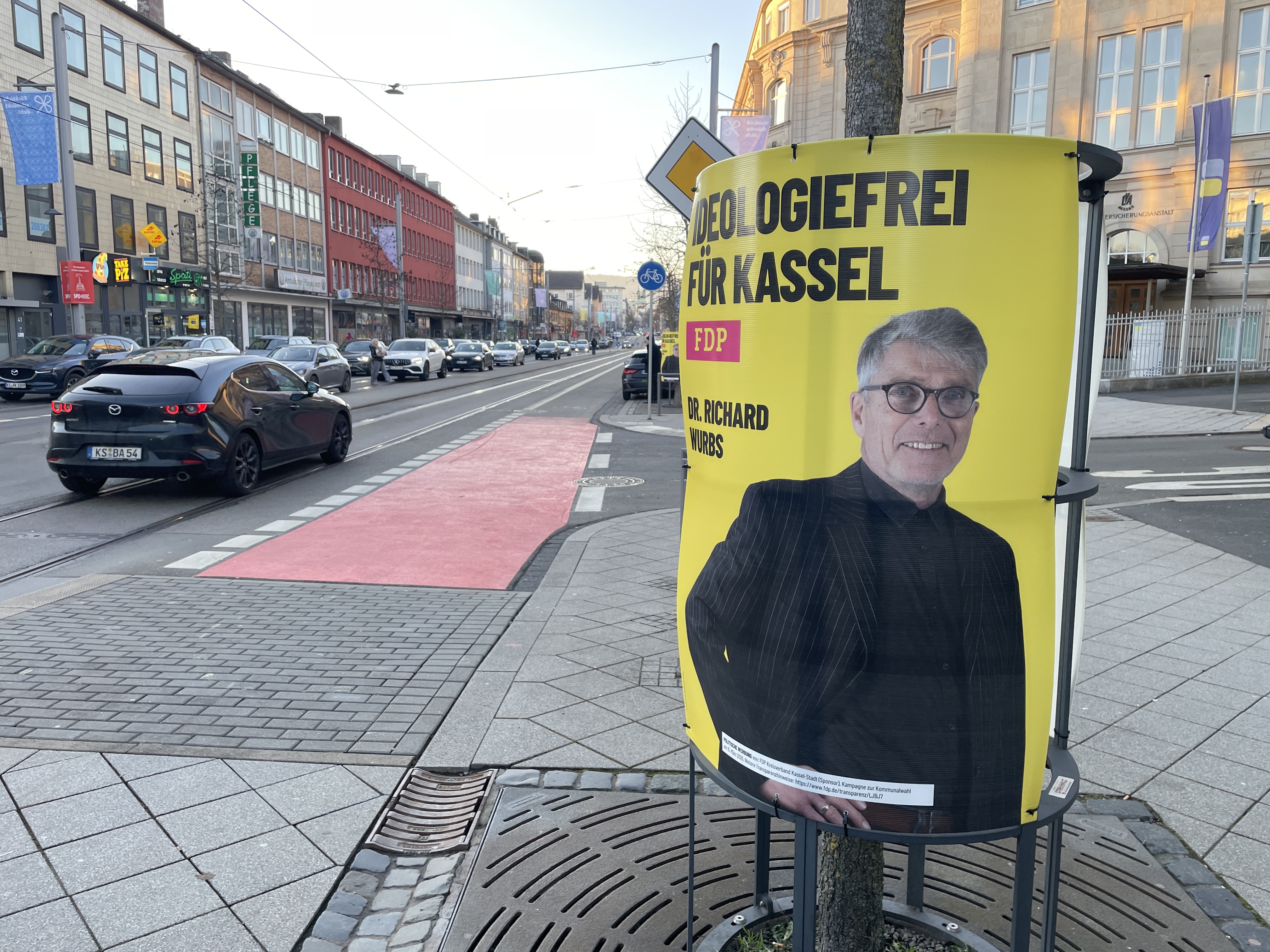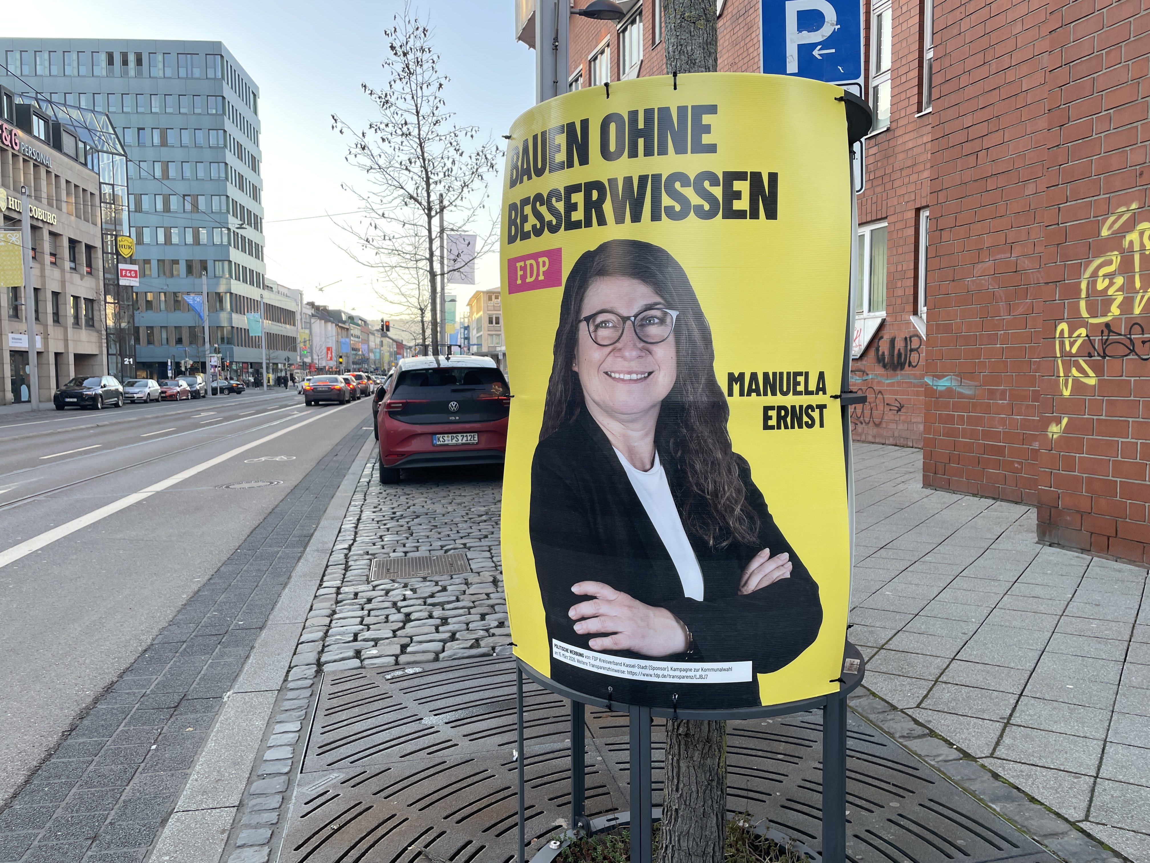 Am Montag, 19. Januar 2026, fielen mir dann zum ersten Mal die gelben Plakate der FDP an der Friedrich-Ebert-Straße auf. Wie die HNA in ihrer Ausgabe vom Dienstag, 20. Januar 2026, schrieb, hat die FDP damit gegen die Kasseler Plakatordnung verstoßen. So begann der Zeitraum für die Wahlplakatierung in Kassel für alle Listen erst am 20. Januar 2026 um 0 Uhr, wie das Ordnungsamt auf HNA-Anfrage mitteilte. Der FDP sei keine Erlaubnis für die frühzeitige Plakatierung erteilt worden. Rund 30 FDP-Plakate in exponierter Lage seien bereits abgehängt, weitere Sanktionsmöglichkeiten würden geprüft, so ein Vertreter des Ordnungsamts gegenüber der HNA.